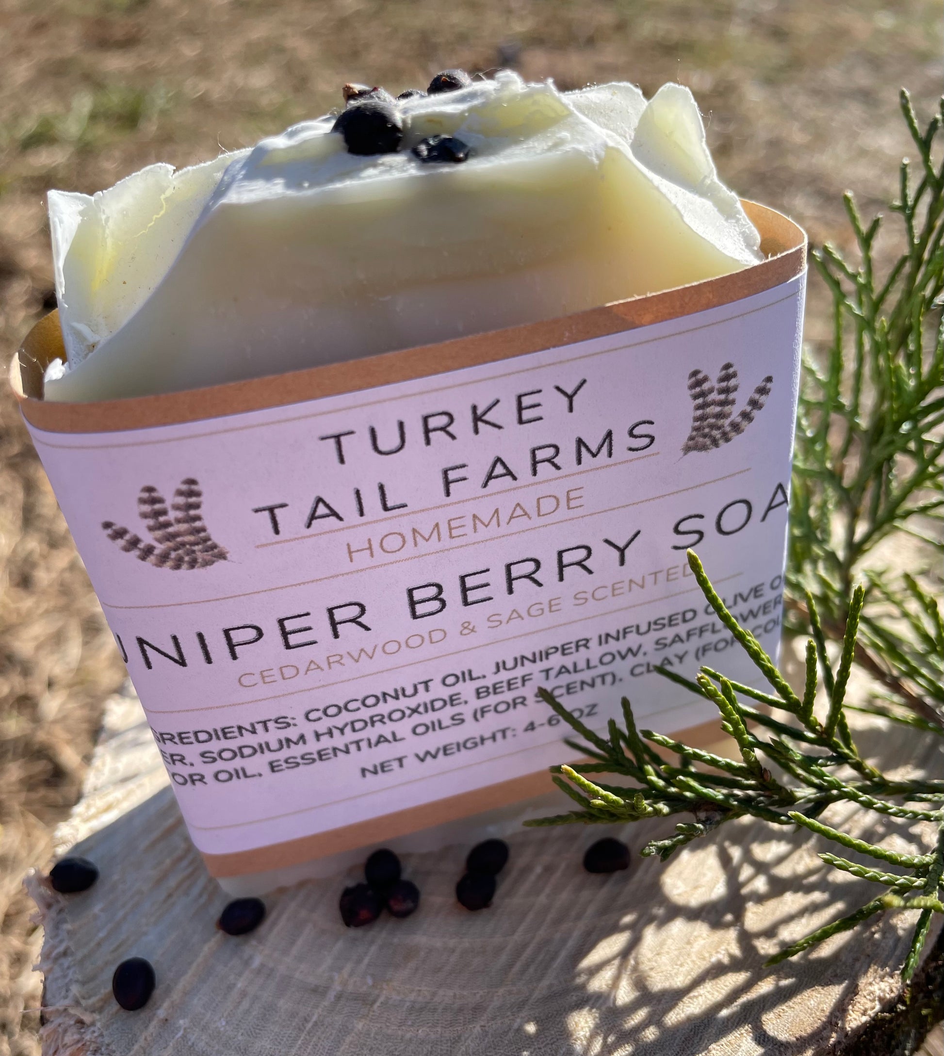 Ingredients: Coconut oil, Juniper Infused Olive Oil, Water, Sodium Hydroxide, Beef Tallow, Safflower Oil, Castor Oil, Essential Oils, Clay. Bars are topped with dried juniper berries for decoration.